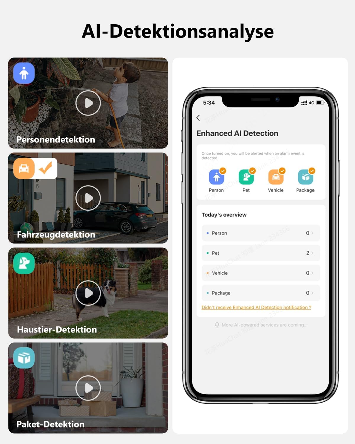 Die Kombination aus PIR Wärmesensor und Künstlicher Intelligenz analysiert jede Bewegung zweifach. Das reduziert Fehlalarme um bis zu 95 %. Alarm innerhalb von 0,3 Sekunden per Push-Benachrichtigung.